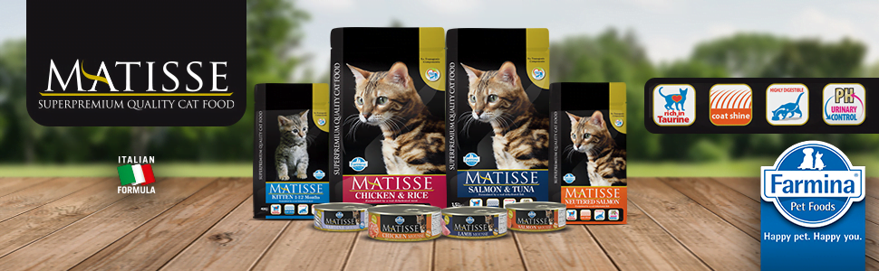 Farmina Matisse este o linie de hrana pentru pisici produsa de catre compania italiana Farmina. Aceasta hrana este conceputa pentru a fi echilibrata si nutritiva, iar ingrediente sunt de înaltă calitate. Farmina Matisse este disponibilă în diferite opțiuni, cum ar fi hrana uscata sau hrana umeda, astfel încât să poți alege opțiunea care se potrivește cel mai bine nevoilor și preferințelor pisicii tale.