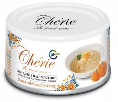Conservele Cherie sunt imbogatite cu clorura de amoniu pentru a mentine nivelul ph-ului din urina sub 6,8, pentru ca pisicile cu boli cronice de rinichi sa o poata manca.