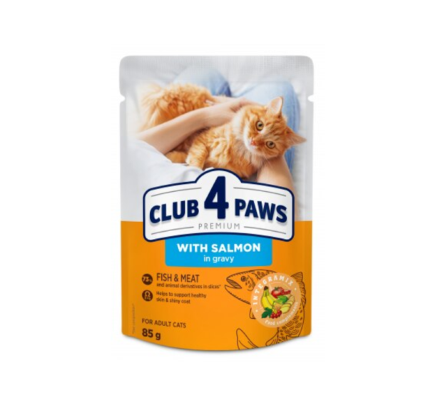 Hrana umeda Club 4 Paws cu somon in sos este o alegere delicioasa si hranitoare pentru pisicile adulte. Cu 73% ingrediente din carne si peste, aceasta formula ofera un aport optim de proteine si sustine sanatatea pielii si a blanii datorita continutului de acizi grasi Omega 3 si 6.