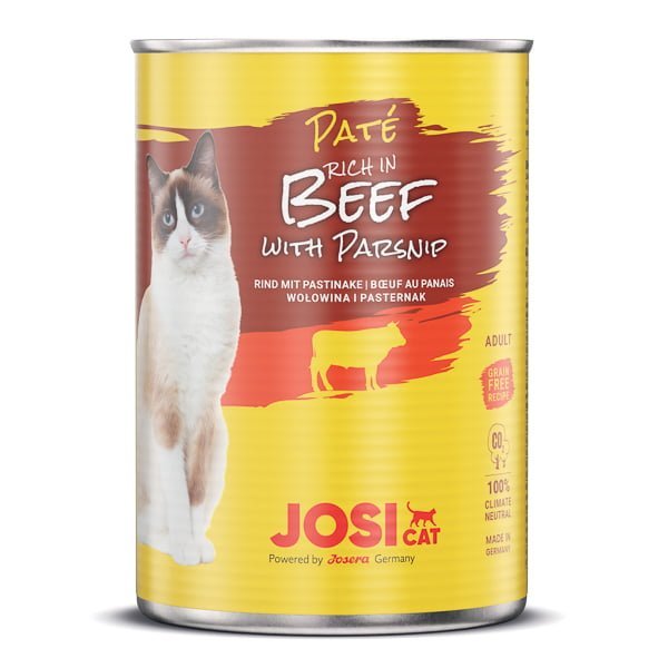 JosiCat paté vită cu păstârnac este exact ce le trebuie pisicuțelor cărora le place ca lucrurile să fie simple, dar delicioase. Pateul este deosebit de bogat în vită, păstârnacul adăugând nuanța finală. Acum pisicile adulte nu-și vor mai întoarce spatele atât de repede bolului lor!