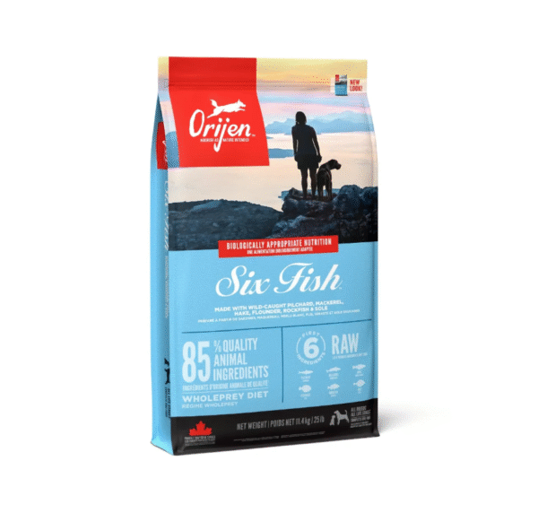 Ofera-i cainelui tau o nutritie echilibrata pentru o diferenta vizibila cu ORIJEN Six Fish, este plin de carne cu proteine nutritive din pasari crescute in sistem liber, peste salbatic si oua din cuibar, livrate proaspete si crude in raport wholeprey.